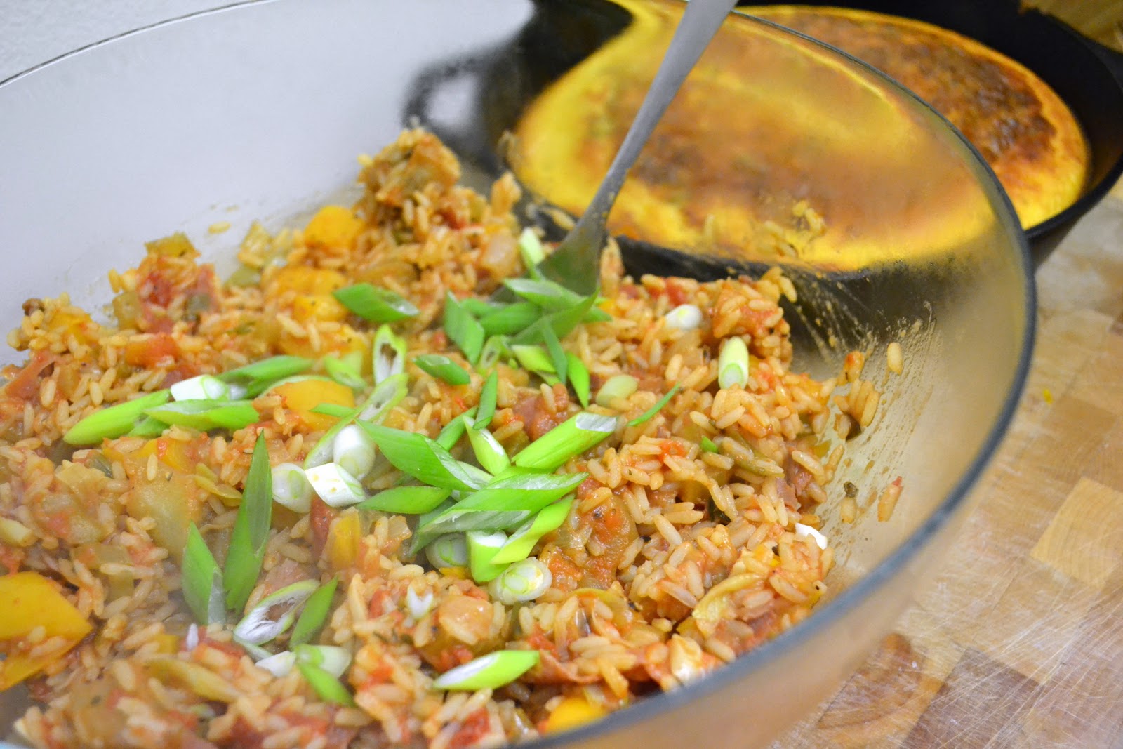 After cooking, move the jambalaya to a bowl, season again with salt and pepper (if necessary) and garnish with the remaining spring onions.